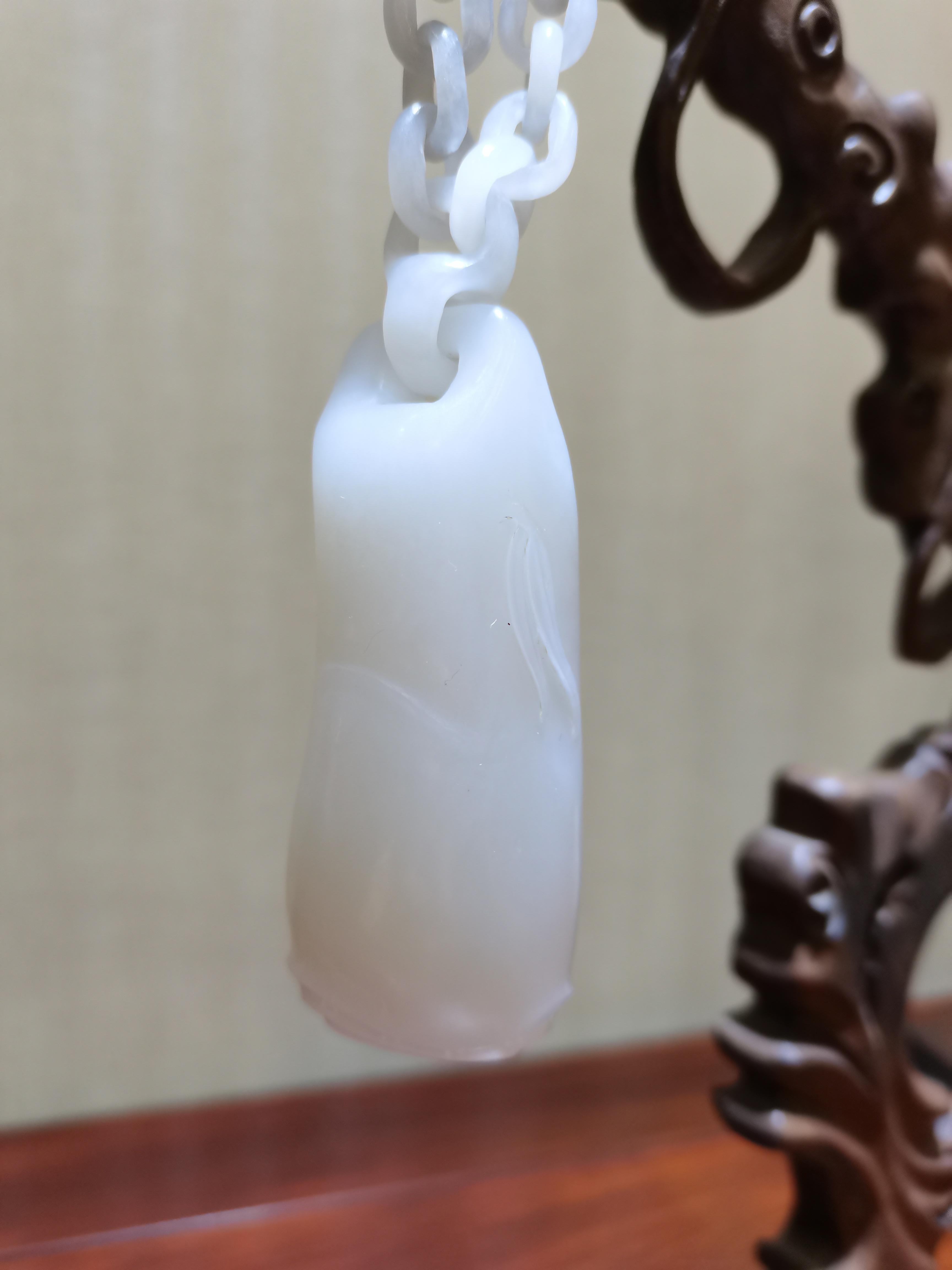 玉質(zhì)溫潤,掛件部分玉色凝白、油脂性強(qiáng),鏈條部分煙青色、質(zhì)感細(xì)膩。加上堪稱雕刻絕技的,鏤空鏈條,使整件作品價(jià)值倍增、十分難得,堪稱賞、玩、藏、傳世之極品。