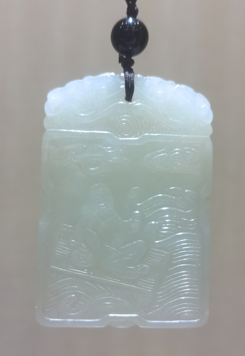 此款和田玉牌,正面雕刻雙龍,寓意雙龍護(hù)主,好事成雙。下刻一老者乘木筏順行于江水之上,舉酒自酌,快意逍遙,引雁回首,云水一色。
