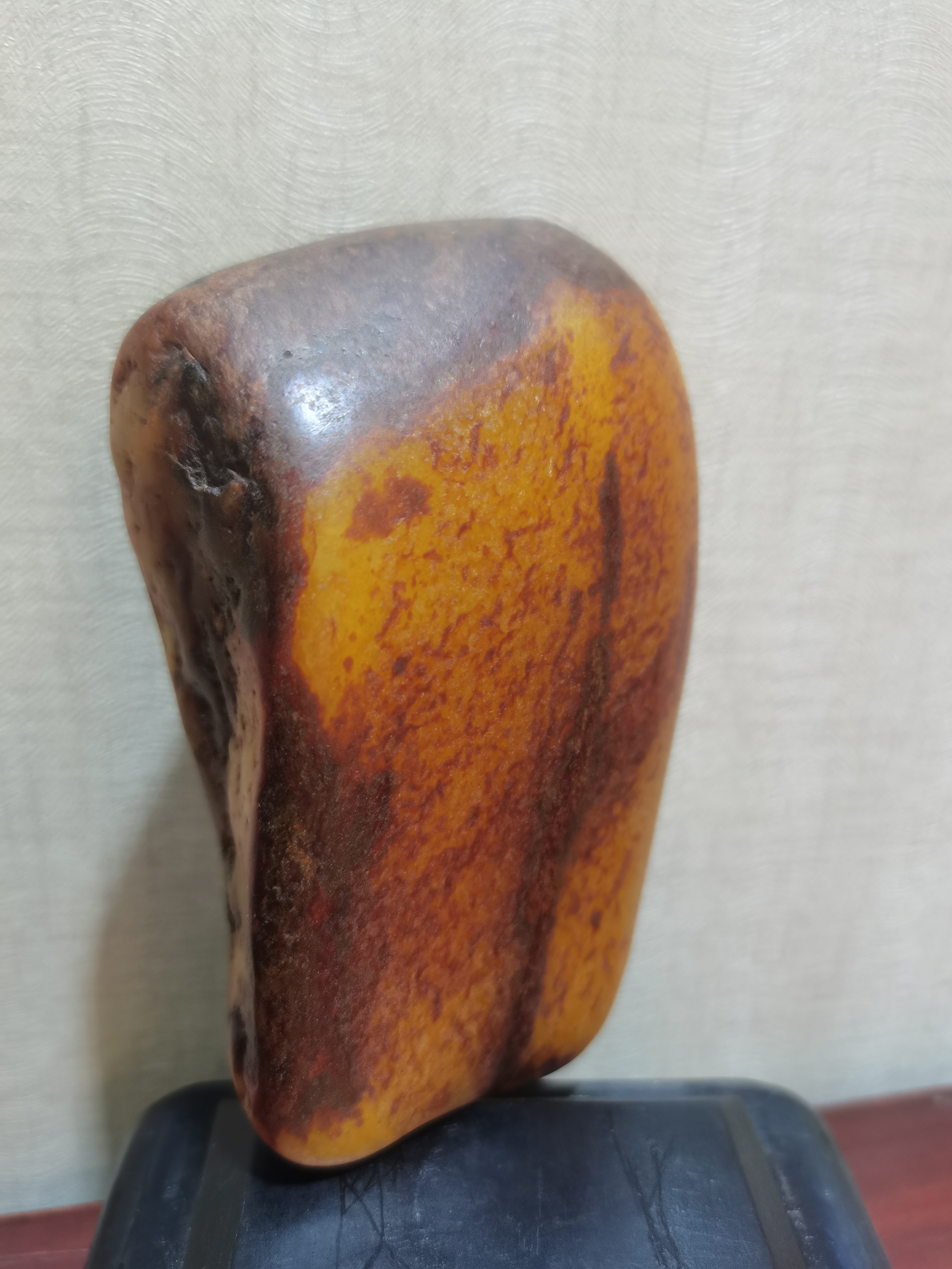 此款棗紅皮籽料,質(zhì)地細(xì)膩,色澤濃郁,顏色分布深淺不一,極有質(zhì)感。天然獨籽,極其難得,通體紅油皮,天然斷口,渾然一體,原石老熟渾厚,韌性強,油性極佳,稍盤就冒油。是極具稀缺性和保值性的賞盤極品。