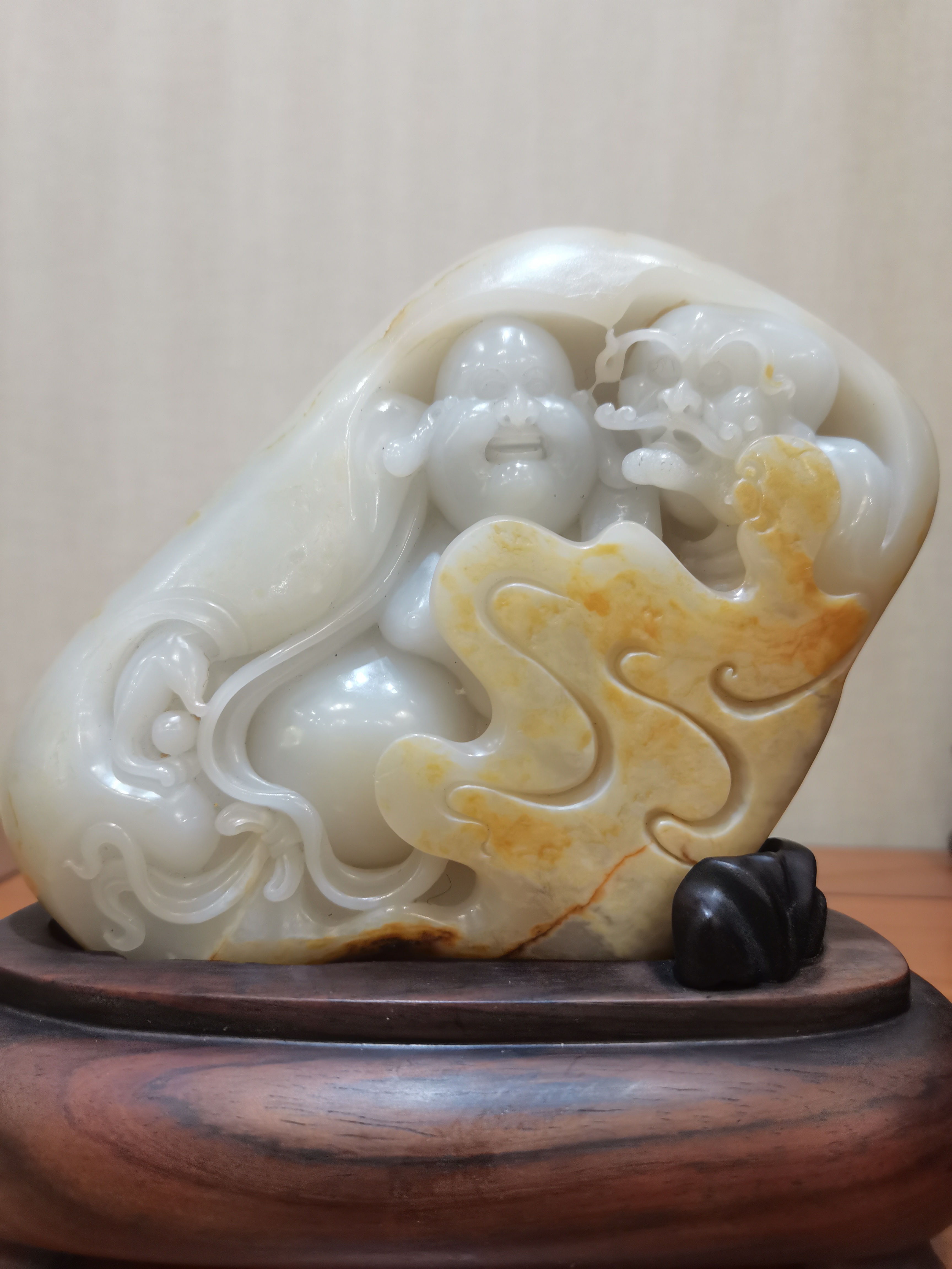稀有的大塊獨(dú)籽雕刻,器型飽滿(mǎn)大氣,非常老熟的玉種,彌勒佛手持寶珠,衣袂飄飄。右邊雕刻羅漢,形象逼真。布局疏朗、層次分明,動(dòng)感強(qiáng)烈,細(xì)節(jié)處理非常精細(xì),曲線流暢自然,如行云流水。兩位仙人同時(shí)護(hù)佑康寧,乃洞天福地。