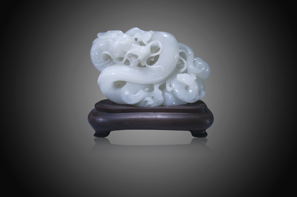 傳說龍能隱能顯,春風(fēng)時登天,秋風(fēng)時沉淵。又能興云致雨和騰云駕霧。龍后成為皇權(quán)、貴族、富貴象征。整幅作品,采用立雕形式構(gòu)思設(shè)計,運用鏤雕、圓雕等多種技法,雕工細(xì)膩,紋理可見。質(zhì)地晶瑩潤澤,打磨細(xì)致。一氣呵成,雕工師法自然,是一件以龍為主題的玉雕精品之作。