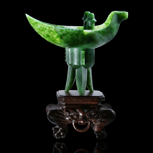 爵是中國古代一種用于飲酒的器皿,以不同的形狀顯示使用者的身份。碧玉的色澤與古銅器經(jīng)過千年而變成的顏色和質(zhì)感極為相似,因此以之仿青銅器極為精妙典雅。