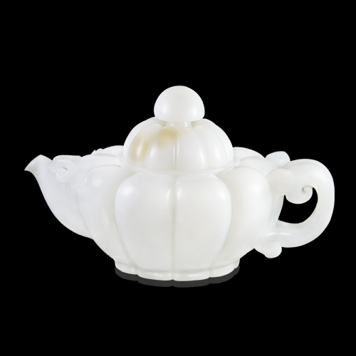 通體雪白無暇、晶瑩飽滿、細膩滋潤如羊脂,壺蓋、壺嘴有天然糖色。執(zhí)壺形,壺身雕刻做南瓜,與壺流相接處鏤雕云紋如意,有壽比南山、福運綿長之吉祥寓意。揚州工力作,玲瓏精巧、秀麗典雅。