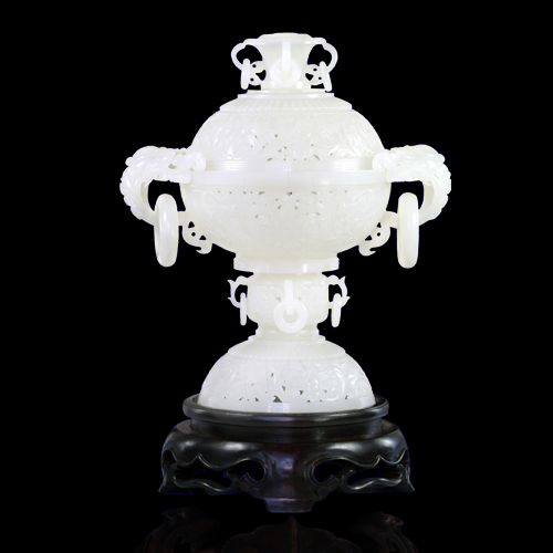 紋飾典雅的香熏爐,古樸敦厚,華貴端莊又瑰麗巧氣,以營(yíng)造怡性逸情的高雅意境,極具深沉雄厚之大氣魄。充分體現(xiàn)作者了“外師造化、內(nèi)得心源”之塑功。