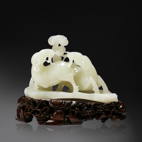 白玉質(zhì),玉質(zhì)上佳,無雜質(zhì),瑩潤如凝脂。圓雕兩只羊和大如意,寓意吉祥如意。造型簡潔明快,刀工精湛,打磨潤澤,更因其質(zhì)地潔白無瑕,使羊之溫順的性情與肥美的體態(tài)得以極好的展現(xiàn)。