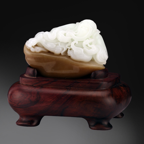 顏色潔白,質(zhì)地細(xì)膩,油潤度極佳,手感溫潤順滑。王羲之是晉代書法家,從家鵝游水中悟出用筆之法,于是養(yǎng)成愛鵝之癖。作品中王羲之閑適而臥,撫須出神,若有所思,白鵝展翅望向王羲之,動(dòng)靜皆宜,惟妙惟肖。