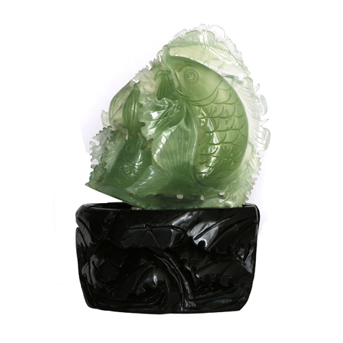 以天然岫玉琢制魚兒及蓮花,魚兒戲蓮,有較好的觀賞效果。玉質(zhì)清新、綠色鮮嫩,款形大小適中,擺放于案頭閑時欣賞,帶給您一份美好的心情。魚通余,蓮諧音連,寓意連年有余。