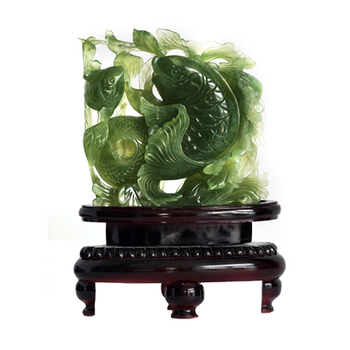 以翻騰的浪花為背景,左下角精心鏤空雕琢魚簍,兩尾鯉魚翹首翻騰,錯(cuò)落有致,顯示出勃勃的生機(jī),整體設(shè)計(jì)恰到好處。魚通“余”,有年年有余、世代富足之意。