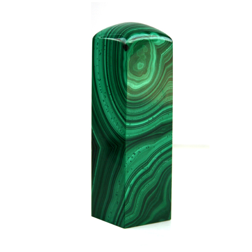 打磨成的印章,自然清新,味意雋永,間或柳葉彎眉,又似清晨露滴。氣質(zhì)獨特,高貴典雅,為印章藝術(shù)的奇葩;天生麗質(zhì),精美絕倫,色彩艷麗,紋理細膩,屬孔雀石上品,可謂“印章皇后”。孔雀石的英文名稱為Malachite,來自希臘語Mallache,指一種叫錦葵(Mallows)的植物,意思是“綠色”,以象征孔雀石的顏色。孔雀石由于顏色酷似孔雀羽毛上綠色的斑點而獲得如此美麗的名字。