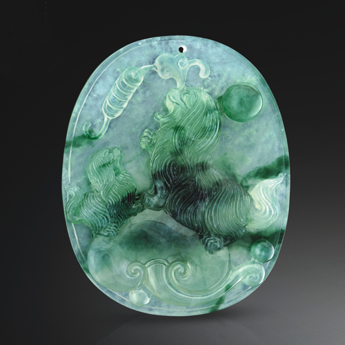 狗狗生動(dòng)活潑,刻畫(huà)入微,綠色摘雕巧妙,寓興旺如意。