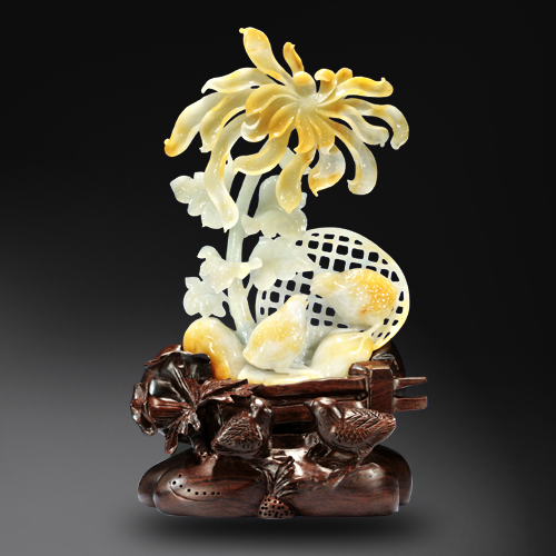 大塊翡色翡翠原石,透過圓雕、鏤雕技法相結(jié)合,雕琢鵪鶉和菊花,寓意安居樂業(yè)。菊花寫實(shí)表現(xiàn)手法,花瓣雕琢栩栩如生;精湛的寫實(shí)鏤雕完美地展現(xiàn)了翡翠的色澤魅力。