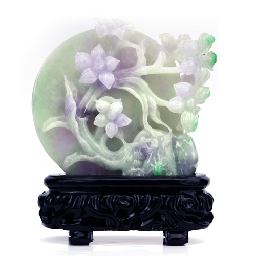 運(yùn)用高浮雕與立體雕結(jié)合的雕琢技法,巧妙地運(yùn)用原料的皮色,色澤過(guò)渡自然,玉石中飄綠而透著紫氣,同樣是姿彩綺麗、明艷動(dòng)人,意境美與色彩美油然而升!