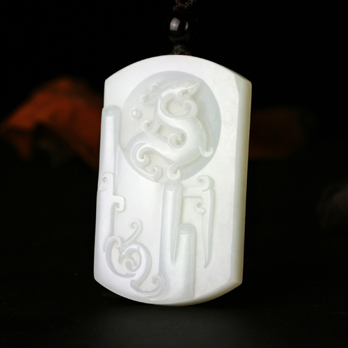此款和田玉龍牌,色潤白、質(zhì)細膩。造器較有特色,上減地浮雕螭龍居于上,昂首挺胸,盛氣凌然。下有造型寫意抽象的鳳首回眸,似聞鳳鳴九霄,靈韻之氣畢現(xiàn)。整牌彰顯大器穩(wěn)重,可謂賞之有味。且大小適中,可佩戴,也適于把玩。